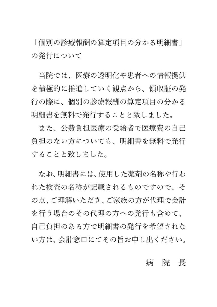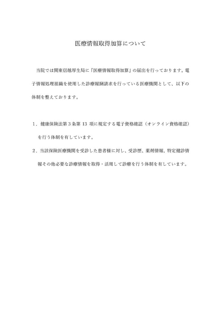 施設基準についてBy yokot @dmin / 2025年10月28日 院内掲示事項 医療DX推進体制整備加算 「個別の診療報酬の算定項目の分かる明細書」の発行について 看護職員の負担の軽減及び処遇の改善に資する具体的な取組内容 医療情報取得加算について